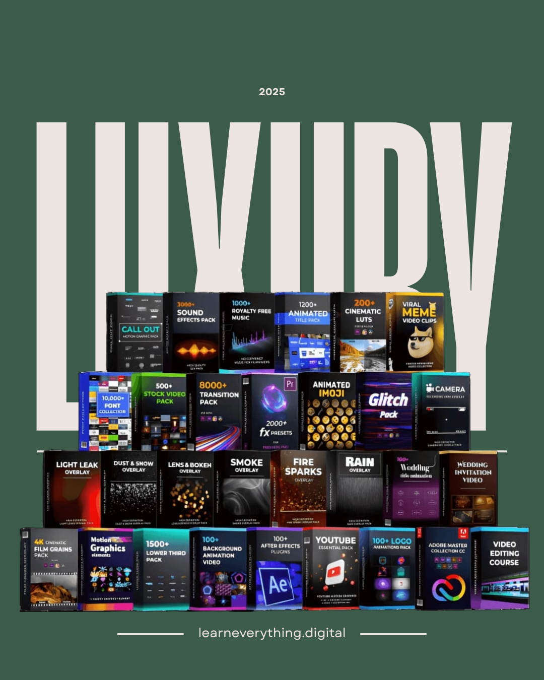 Over 50 packages including 2000+ Lightroom presets, 1500+ Premiere Pro transitions, 300+ wedding text logos, and more, providing all the tools you need in one bundle.
